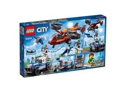 Defend the skies and recover the stolen gem with the 60209 Sky Police Diamond Heist set. Build a massive armored police transporter with opening roof, removable safe, and jail cell. Launch into action with a winged police jetpack and chase the crook's helicopter, complete with spinning rotors and climbing rope. Includes 4 minifigures—2 Sky Police officers and 2 crooks—plus handcuffs, helmets, and a gem element. Features a working light and sound brick for realistic police action.