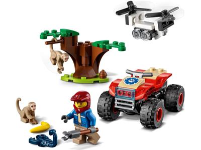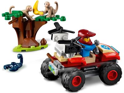 Explore nature with the LEGO City Wildlife Rescue ATV (60300)! This set includes a steerable ATV with a grabber tool and drone, plus a small savanna scene with an explorer, two monkeys, and a black scorpion. Perfect for kids aged 5 and up.
