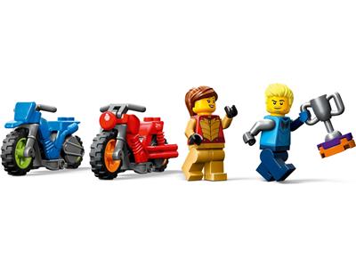 Kids aged 6+ can stage exciting shows and competitions with the LEGO City Spinning Stunt Challenge playset, featuring a spinnable double jump ring, two ramps, and two flywheel-powered stunt bikes, complete with two rider minifigures.