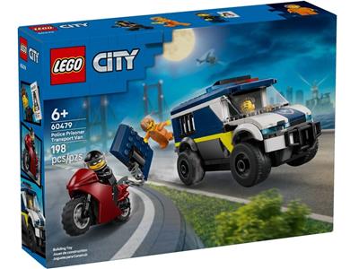 The LEGO City Police Prisoner Transport Van (60479) building set for kids ages 6 and up includes a police truck with a drivers cab and a jail cell for 2 crooks, plus a toy motorcycle with a chain and hook to pull the cell door open. The set comes with a police officer and 2 crook minifigures for jailbreak role play. With 198 pieces, this building kit makes a great gift for creative kids and fans of LEGO City Police playsets.