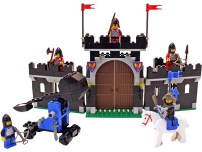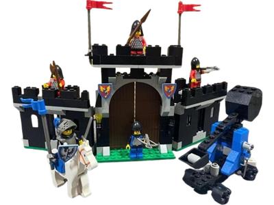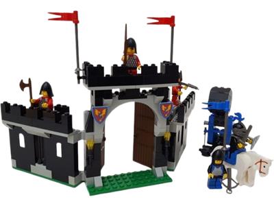 A fortified town entrance featuring a catapult positioned for defense and an adjacent prison structure.