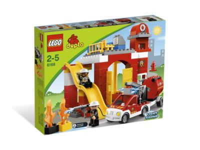 Explore the exciting world of firefighting with the LEGO DUPLO Fire Station. When the alarm sounds, slide down the slippery pole, jump into the fire vehicle, turn on the siren, and activate the flashing lights. This action-packed set includes everything a young firefighter needs, featuring two firefighter figures, a fire truck with a trailer, a slide, a garage, an office, and a computer. Accessories include an axe, a fire hose, a flame, and a decorated DUPLO brick. With working siren and lights, this familiar fire theme helps children develop their imagination. DUPLO products are safe and fun for little hands. The set measures over 12 inches long, 13 inches wide, and 10 inches tall.