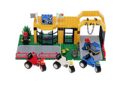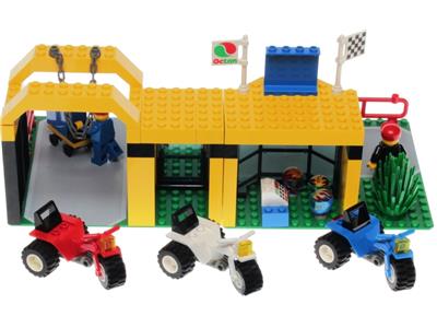 The Pit Stop is fully equipped with the latest tools to handle any mechanical issue. It offers ample space for three mototrikes, two four-wheeled vehicles, and an additional trailer. The crew can quickly switch from skilled mechanics to off-road racers, complete with custom flame-decorated helmets. Designed for ages 5 and up.