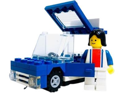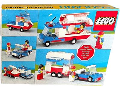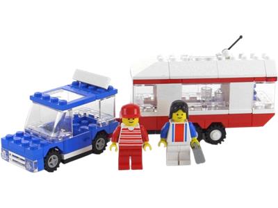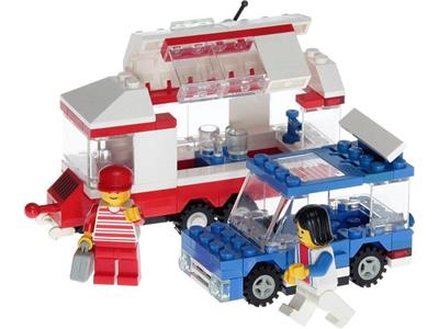 This vehicle combines a car with a camper, featuring a roof that opens to create space for two figures to sit comfortably at the built-in dining table.