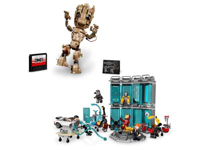 Explore Tony Stark's Hall of Armor, featuring the MK3, MK25, and MK85 Iron Man suits, plus workbenches and a suit-up platform. With Iron Man, Pepper Potts, Nick Fury, War Machine, and Whiplash included, adventure awaits. Build and pose your own play-and-display Groot, recreating his dance moves from Guardians of the Galaxy Vol. 2, complete with a pretend cassette tape for music fun.