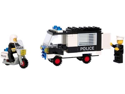 Complete, with instructions, without box. The hat helmet and police on 1 window are made black with a marker. In heavy played condition. 1 handle of motorcycle is broken off and missing. |