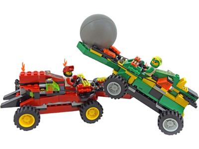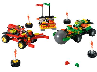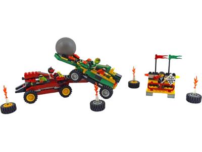 Two high-speed race cars equipped with gripping arms battle for control of a rolling ball in this fast-paced, head-to-head competition. Challenge a friend to score the most goals while using strategic collisions to knock the ball loose from your opponent. This action-packed set includes two race cars, two drivers, a referee, and a ball for intense, rough-and-tumble fun.
