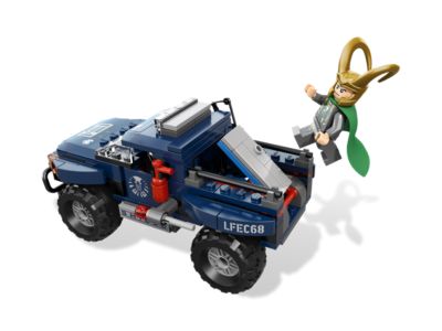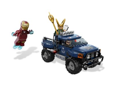 Loki is making a daring escape from S.H.I.E.L.D. headquarters, having stolen the powerful cosmic cube. Iron Man must soar into action in his advanced armored suit to pursue the villain's rugged off-roader before he can unleash the cube's destructive power. The set includes Iron Man, Loki, and Hawkeye minifigures. The off-roader is equipped with two flick missiles and a tipping function. Accessories include the cosmic cube and Loki's staff. Iron Man features an opening mask and thruster flame elements. Engage in a high-speed chase, fire the off-roader's missiles, and use the tipping function to dislodge Loki when Iron Man closes in for an attack.