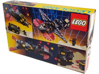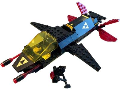 The Blacktron Cruiser is a sleek three-section spacecraft with adjustable wings that pivot for dynamic flight poses. Two hidden compartments open to reveal storage areas, while the detailed cockpit features seating for a minifigure pilot.