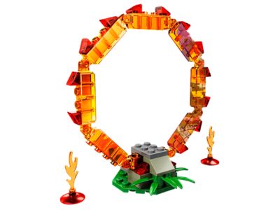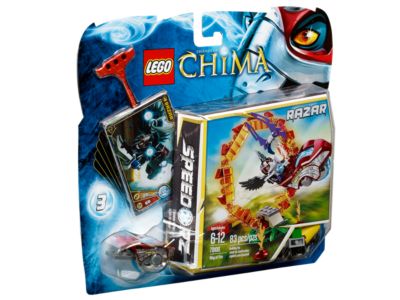 Take on the fiery challenge of the Ring of Fire and battle for CHI! Attach Razar to the raven Speedor, pull the rip cord, and launch up the ramp to soar through the flaming ring. Customize your run with a flame-fueled exhaust power-up or adjust the challenge with fire cones and a resizable ring. Compete with friends in this fast-paced game of timing and accuracy. The set includes a Razar minifigure with two weapons, the Speedor, a rip cord, a power-up, a ramp, two fire cones, six CHI, and five game cards.