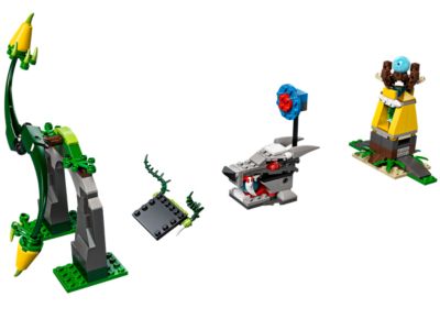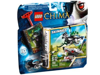 Embark on an adventure in Chima with the exclusive Skinnet minifigure. Launch the skunk Speedor using the ripcord, aiming to soar over the wolf head and strike the target to capture CHI. Enhance stability with the attachable power-up. This skill game challenges your accuracy and timing for one or more players, complete with two weapons, six CHI, and five game cards.