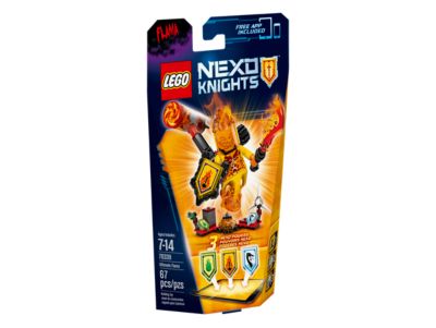 Ultimate Flama unleashes fiery chaos with his Flame Wreck hammer, creating a blazing ring of fire around foes. He also wields a slime stud shooter and icy water to drench enemies. Enhance your strategy by scanning shields to unlock three NEXO Powers—Flame Wreck, Slime Blast, and Ice Dragon—for your digital collection in the free LEGO® NEXO KNIGHTS™: MERLOK 2.0 app.