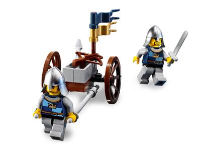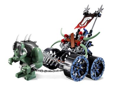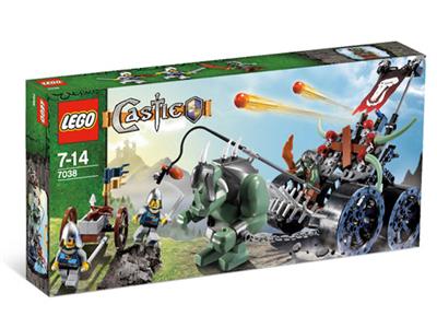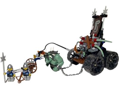 The trolls are on the attack, rolling forward in their spiked assault wagon with a massive cannon ready to fire. A giant troll pulls the wagon, lured by a dangling chicken drumstick, while a fierce troll warrior rides atop. Two heroic knights stand ready to defend, battling to stop the advance. Press the button to launch missiles from the cannon and watch the wagon's spikes and flag move as it rolls. This action-packed set includes a giant troll figure over 3 inches tall, with the complete wagon and troll measuring 9 inches in length.