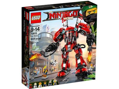 Ignite the battle against the shark army with Kai's formidable Fire Mech! This massive, highly posable LEGO® NINJAGO® MOVIE™ mech is built for sizzling action. It features an opening minifigure cockpit, two shoulder-mounted disc shooters, and arms equipped with non-shooting fire blasters adorned with translucent flame elements. The set comes packed with six minifigures—Kai, Zane, Lauren, Henry, Hammer Head, and Jelly—each with their own signature weapons like katanas, a bow and arrow, a fish hammer, and a fish-zooka. Additional details include decorated fire tanks, samurai-style flags, and fun accessory elements like an ice cream cone and popsicle. Unleash thrilling role-play adventures and recreate epic scenes from the movie!