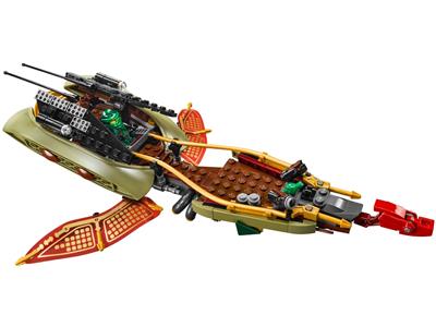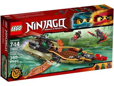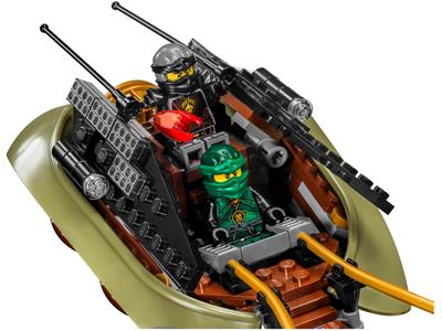 Fight the Vermillion for control of the Pause Time Blade with Lloyd and Cole aboard Destiny’s Shadow. This convertible boat/flyer features flip-out wings for flight mode, two stud shooters, plus two detachable canoes and two oars. Dial up the ninja vs. Vermillion conflict with Vermin’s V-shaped hoverboard and Vermillion axe. Includes three minifigures. Build the Ninja’s swamp vehicle Destiny’s Shadow that both sails and flies, with stud shooters, flip out wings for flight mode, and two detachable canoes. Includes three minifigures: Lloyd, Cole, and Vermin, plus two katanas and Vermin’s vermillion axe.