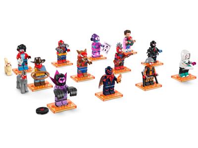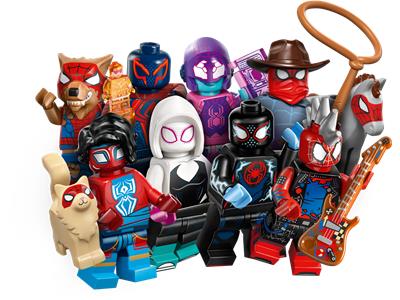 Kids aged 5+ can collect and build 12 different Spider-Man: Across the Spider-Verse minifigures in a LEGO mystery box, including Miles Morales, Spider-Gwen, and Spider-Punk, each with at least one accessory and a collector's leaflet for play or display.