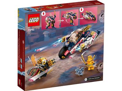 LEGO NINJAGO Sora’s Transforming Mech Bike Racer (71792) for ages 8+ includes a posable mech that transforms into a ninja bike with golden blades and 2 stud shooters, plus 3 minifigures: Arin, Sora, Rapton, and a Baby Riyu dragon model. Rapton comes with an Imperium sword and a glider with 2 stud shooters.