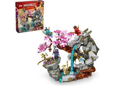 The Dragon Stone Shrine (71819) is a detailed LEGO NINJAGO playset for ages 13 and up, featuring an interactive stone dragon, a movable training area, a waterfall, a cherry blossom tree, a library with scrolls and a secret room, and a tea set. It includes six minifigures: Master Lloyd, Master Wu, Nya, Kai, Euphrasia, and Lord Ras, each with unique weapons and accessories.