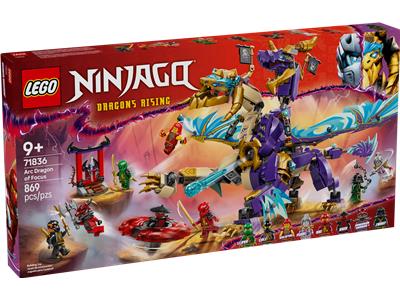 Ignite epic battles with the LEGO NINJAGO Arc Dragon of Focus (71836), featuring a formidable two-headed dragon with posable limbs, a chest shooter, and large foil wings controlled by a back lever. This action-packed set includes eight character minifigures—heroes Lloyd, Cole, Wyldfyre, Kai, and Pixal, plus villains Drix, Zarkt, and a Dragonian Warrior—all armed for combat. Enhance the adventure with a Spinjitzu spinner vehicle that launches into a rapid spin, releasing power elements upon impact. Perfect for recreating thrilling scenes from the NINJAGO Dragons Rising TV show, this set offers endless imaginative play for kids aged 9 and up.