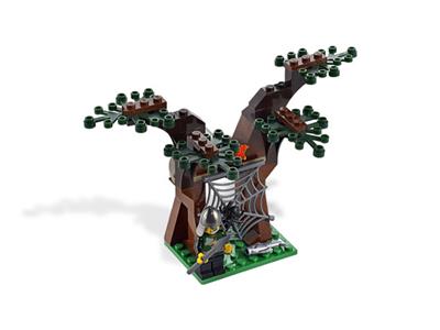 The royal treasure carriage races through the enchanted forest, under siege by dragon knights lying in ambush. A brave knight steers the horses, fighting to protect the cargo of gold and jewels. Beside him, the king wields his legendary golden sword against the attackers. Watch for the catapult hammer swinging down to smash the carriage! The set includes the king, his loyal knight, and two dragon knights, plus two horses, a spider in its web, and glittering treasure.