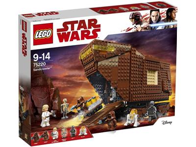 Relive the iconic desert planet scenes from Star Wars with the LEGO Star Wars 75220 Sandcrawler. This mobile fortress of the Jawas features an opening two-minifigure cockpit, steering tracks, and removable panels that reveal an interior droid prison and an articulated crane for loading droids. The front ramp lowers for unloading cargo and the buildable transport vehicle. Young fans will love reenacting scenes from Star Wars: A New Hope, where Luke Skywalker and the Jawas negotiate over droids. This set includes four LEGO minifigures—Luke Skywalker, two Jawas, and an RA-7 droid—plus an R5-A2 astromech droid and a medical droid. The Sandcrawler's removable top and side panels provide easy access for play, while interior details include a droid prison chamber, a crane for loading, and runners for offloading the buildable transport vehicle.