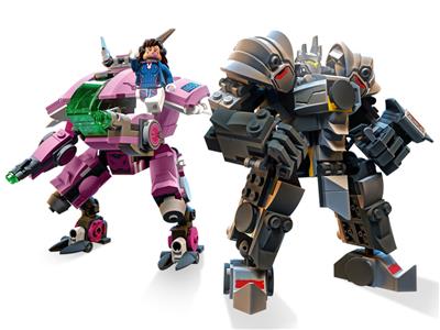 A LEGO® Overwatch set featuring buildable mech suits for D.Va and Reinhardt. Each tank opens to house its corresponding highly-detailed minifigure. D.Va's mech includes a shooting function and her Fusion Cannons, while Reinhardt's model comes with his buildable colossal Rocket Hammer. Perfect for play or display alongside your gaming setup.