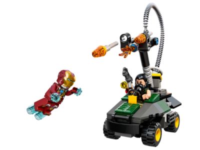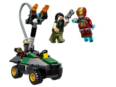 Face off as Iron Man against the Mandarin in a final battle at the Miami docks. Take on the ultra-tough armored car with a rotating flamethrower and launch dual flame flick missiles. Fly around the villain and avoid getting scorched. Includes 2 minifigures: Iron Man in Heart Breaker Armor and the Mandarin, plus a pistol. Rotate the flamethrower and fire the missiles. The Mandarin’s armored car is over 5 inches high, 3 inches long, and 2 inches wide.