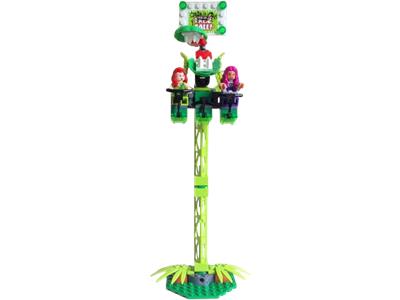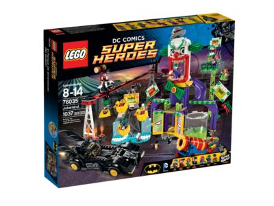 Drive the Batmobile into Jokerland to rescue Robin, Starfire, and Beast Boy. Dodge the cannon and fire missiles at the clown robot. Use super-jumping to topple The Penguin, launch Robin off Harley Quinn’s bike, knock Poison Ivy from her branch, and send The Joker sliding into the poison pool chamber. Includes Harley Quinn’s bike with handcuffs and a bike-launch function, The Penguin’s rotating duck seats and toppling podium, plus dynamite and translucent flame pieces.