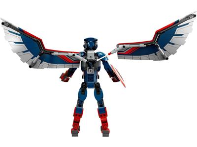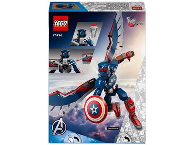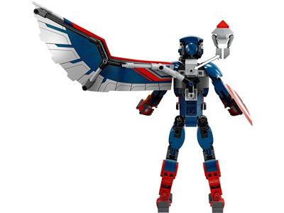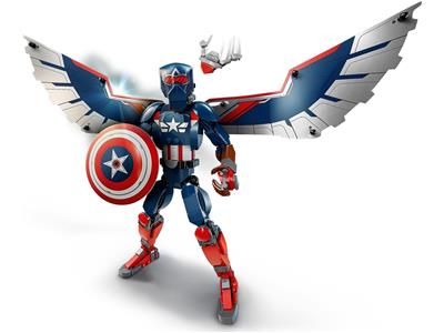 The buildable LEGO Marvel New Captain America Construction Figure, inspired by the winged Falcon as Captain America, stands over 11 inches tall and features fully movable joints for realistic action poses. It includes large, bendable foil wings on the back, a detachable shield, and a removable Redwing drone toy for versatile play.