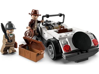 LEGO® Indiana Jones™ Fighter Plane Chase (77012) includes a fighter plane with a spinning propeller, 2 stud shooters, and removable wings, plus a vintage convertible car with a chest storing an umbrella and a pistol. The set features three minifigures: Indiana Jones with his whip, his father Professor Henry Jones Sr.™ with a diary, and a fighter pilot, allowing kids to recreate the famous chase scene from Indiana Jones and the Last Crusade.