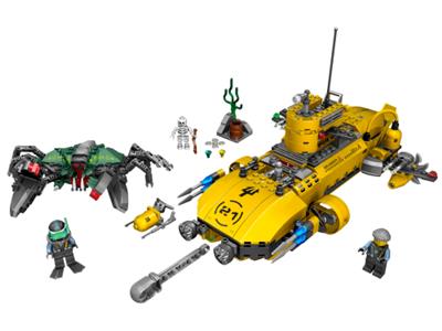 Dive into thrilling underwater adventures with this sea explorer submarine, armed with cannons, harpoons, and sea missiles for epic oceanic battles. Command a detachable mini-sub and confront a giant, posable crab with moving legs and claws. Fire the undersea launcher and lead two diver mini-figures against a skeletal foe across 590 pieces, delivering action-packed deep-sea excitement.
