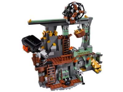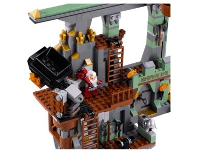 Join Bilbo and the Dwarves on a daring quest into The Lonely Mountain to find the secret door to Smaug's lair. Dig for gold using mining tools and a slide, then transport it with a pulley bucket to the forge. Watch for the staircase trap as you seek the Arkenstone, and fire melted gold from the giant catapult to defeat the dragon. Includes 5 minifigures and a Smaug figure.