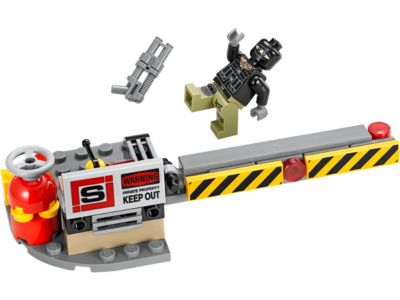 Speed through the city streets in the Turtle Van to rescue Michelangelo from the Foot Soldier's barricade. Use the on-board computer to outsmart the blockade, then accelerate and crash through. Unleash hidden side missiles and fire roof missiles to blast the gate open. Find Michelangelo, release the mechanical arms holding him, and crank up the Turtle Power for a swift escape. This set includes four minifigures with weapons: Vern, a Foot Soldier, Raphael, and Michelangelo. The Turtle Van features a removable roof, computer screen, fold-out side missiles, roof missiles, a satellite dish, hook, and winch. The barricade gate has a movable arm and crash break.