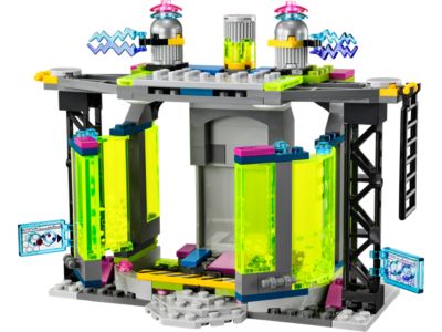 Raphael uncovers the Kraang's secret mutation lab, where humans are transformed into mutant creatures. With Victor, he climbs the ladder to the chamber, spins the electrodes, and triggers the mutation process. After activating the tank, the terrifying Spider Bytez emerges. Raphael must evade the creature's massive head claws and make a daring escape. The set includes Raphael and Victor minifigures with weapons, plus the Spider Bytez figure. The Mutation Chamber features a working knob, spinning electrodes, opening doors, a ladder, and translucent elements.
