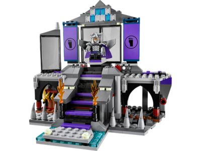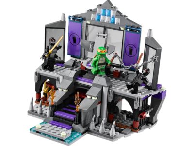 Glide to the rescue with Raphael in the flying Turtle vehicle to save Michelangelo from Shredder's Lair. Soar through windows into the dungeon, but stay alert for hidden traps, collapsing stairs, and a saw blade shooter. Battle the four-armed Robo Foot Ninja and use the grapple hook to pull open the dungeon door. Turn on Turtle Power to defeat the Foot Soldier and stop Shredder before he escapes in his throne-turned-pod. This set includes five minifigures with weapons: Michelangelo, Raphael, Shredder, a Foot Soldier, and a Robo Foot Ninja. The lair features Shredder's transforming throne, opening windows, and interactive traps.