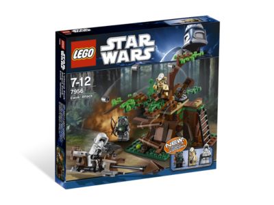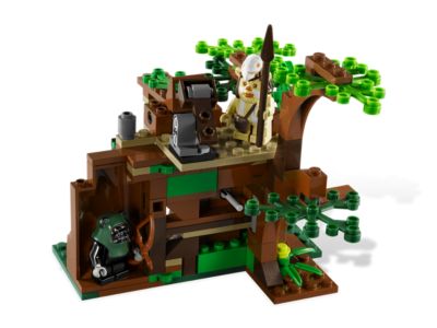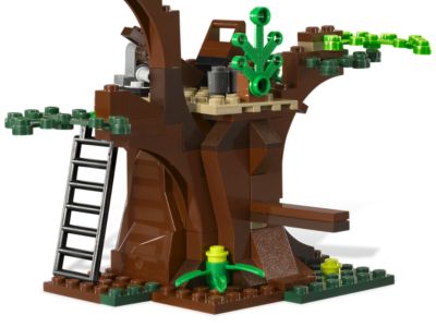 Lead the Ewoks in a surprise attack on the Imperial scout trooper from their treetop hideout. Use the stone launcher and tumbling logs to strike, then hide in the secret compartment and pull up the ladder for safety. Includes three minifigures—Imperial scout trooper with speeder bike, Logray, and an Ewok warrior—plus weapons. The hideout measures over 6 inches wide and 4 inches tall, while the speeder bike is over 5 inches long.