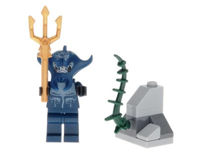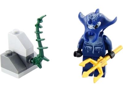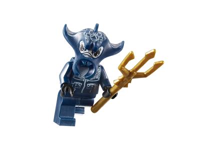 A Manta Warrior, cloaked in seaweed, emerges from behind a rock with a raised trident, ready to defend the secrets of the lost city of Atlantis.