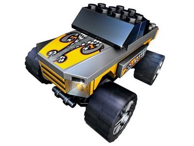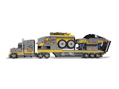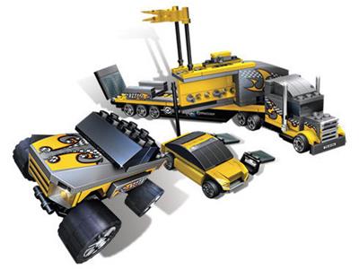 Get ready to roll out the ultimate stunt show! Haul the massive team truck and trailer to the venue, then unload everything needed for an epic racing event. Set up the course with flags and ramps, then rev up the giant-wheeled monster truck. Will you soar over the stunt car or smash right through it? The choice is yours in this action-packed set!