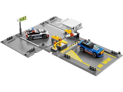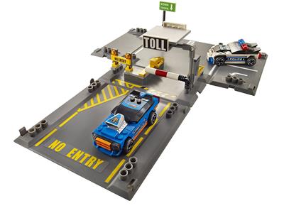 Unfold the storage box to reveal an intense racing chase! The daring blue racer speeds away, pursued closely by a determined police racer. Will they clear the toll booth before the barrier drops? Build the scene, enjoy the chase, then fold it back into a compact box. Collect all four LEGO® Racers fold-out sets to expand the action and create the ultimate race track!