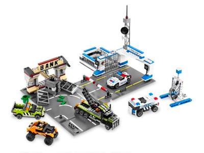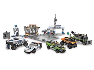 Unfold the box and dive into an intense police chase, crafting a thrilling bank heist scene with police squad cars in hot pursuit. Slam the police car through city streets as you chase the bank robber truck, then go after street racers and throw them in jail. The set includes a slammer, safe, bank with exploding windows, and a jail with breakout walls. Take this portable box on the road and build five cool vehicles. Each emergency vehicle measures 3 inches (7 cm) long, while the truck is over 5 inches (12 cm) long.