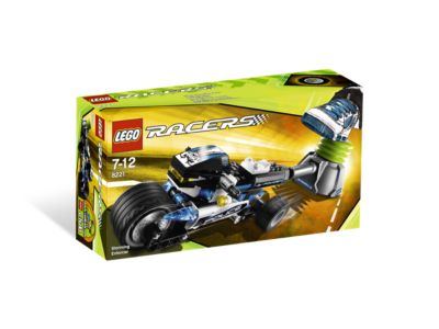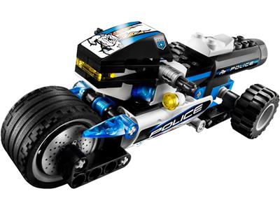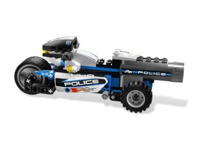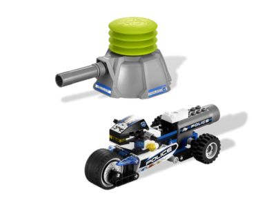 Race from the Storming Enforcer on your three-wheeled police bike! Load your vehicle onto the air stomper, then stomp the pump to launch the Enforcer into action. Watch it speed off with its wide front wheel and powerful jet engine, ready for high-speed chases. This detailed racer features a bold bulldog logo and delivers real stomp-powered racing fun.