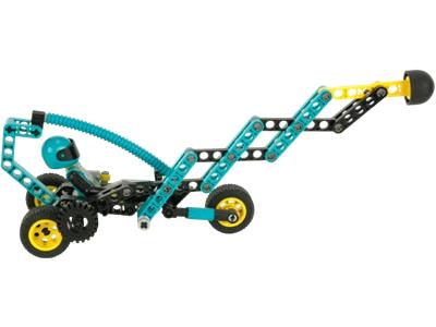 The Pincer is the ultimate battle arena. Construct two opposing vehicles and prepare for combat. Use your vehicle's jaw-tong arm to strike the opponent, making its head snap back as new eyes appear. This releases a rubber band, propelling your vehicle forward. If you collide with the opponent's front, your claws activate for a surprise attack. Your mission is to target those eyes once they appear! Ages 9 and up.