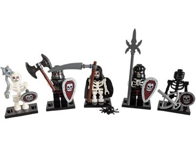 Expand your LEGO Castle battles with this set of five skeleton warrior minifigures. Each figure is uniquely designed with sinister details, complete with an arsenal of weapons, armor, and gear. A creepy spider accessory adds an extra touch of menace to your undead legion.