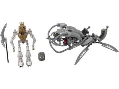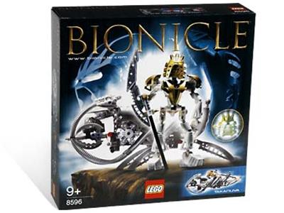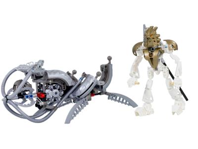 The Seventh Toa has arrived to challenge Makuta's darkness and free the Matoran. Wearing the Kanohi Avohkii, the Mask of Light, and armed with the Kolhii Staff of Light, he rides the Ussanui, a vehicle built to speed through the island's ancient tunnels toward Makuta's lair. Lower the Ussanui's landing gear by pushing the lever, and insert the Kraata to aid in tracking Makuta. Combine this set with Makuta (#8593) to construct the mighty Takutanuva and bring the final battle to life.