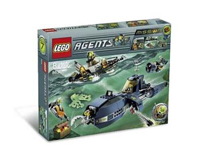 Embark on a covert underwater operation with the LEGO Agents to protect sunken treasure from the villainous Dr. Inferno and his henchmen, Slime Face and Break Jaw. Navigate the tactical operations submarine equipped with a detachable scuba jet and grappling hook to outmaneuver threats like a glow-in-the-dark octopus and enemy boats armed with rocket and torpedo launchers. Launch underwater missiles, store treasure in a secret hold, and take control from the cockpit to complete your mission.