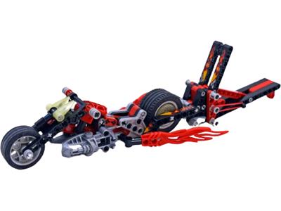 Slammer-powered dragster bike featuring glow-in-the-dark wheel discs and headlights for high-speed night racing, equipped with super-wide tyres for maximum grip. Combine with set 8646 to construct a custom hotrod.