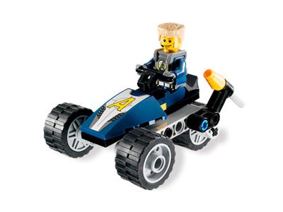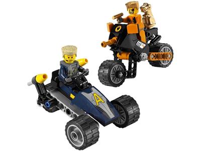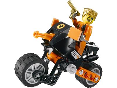 Agent Swipe, Gold Tooth has stolen a valuable golden statue and is escaping on a high-tech motorcycle. Stop him at all costs using the Agent Supertrike, equipped with two flick-fire missiles. Includes Agent Swipe and henchman Gold Tooth minifigures.