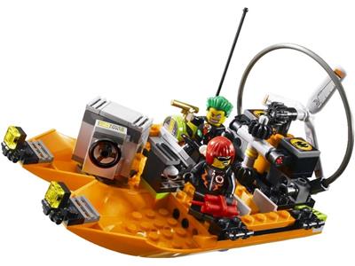 Agent Fuse, the villains Dollar Bill and Dyna-Mite have escaped with the stolen bank safe on their Super Airboat. Pursue them with your Waterjet vehicle, armed with dual flick-fire missiles. Avoid the airboat's deployed explosives. The high-speed chase is on—spin the airboat's propeller as it races away. This set includes Agent Fuse, Dollar Bill, and Dyna-Mite minifigures for an immediate showdown.