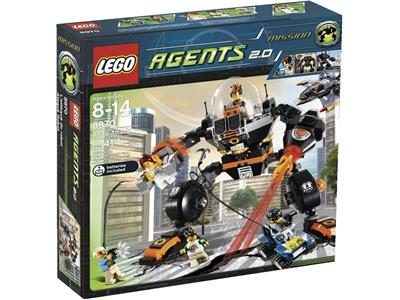 Agents Trace and Chase must stop Dr. Inferno and his monstrous robot, which splits into two sections—the upper body transforms into a fly-away vehicle. The robot features a giant claw, a flame arm with a light-up function, and measures 9 inches tall with a 15-inch arm span. Use the Agent Super Jet with flick missiles and the harpoon-equipped Quad Bike to disable the machine and capture the villain before he escapes in his jet-pod. Includes 6 minifigures: Dr. Inferno, Agents Trace and Chase, and 3 tourists.
