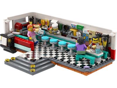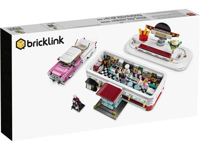 A detailed retro 50s diner playset with authentic 50s style and sturdy modular build quality. The set includes around 900 pieces, packed with classic features like a jukebox, detailed kitchen, retro stools, tables and chairs, a small gas pump outside, and an oversized rooftop sign with a 3D burger and fries. A stylish pink automobile completes the iconic look. Designed for both play and display, it fits perfectly into any LEGO town, whether period or modern.
